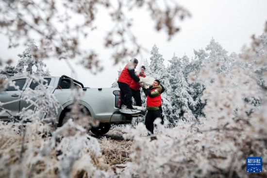 1月22日,在广西桂林市灵川县海洋乡小平乐村的山腰上,当地政府责任主谈主员给公共运送物质。