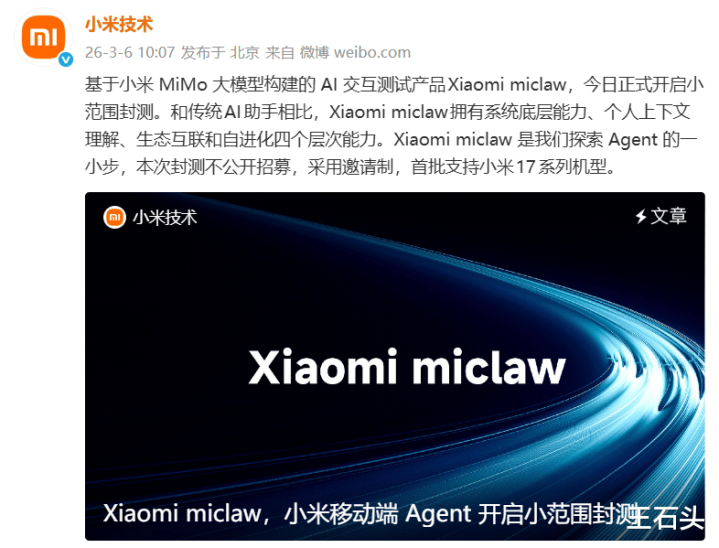 当前首款手机版“龙虾”也认真官宣了,今天小米蓦然官宣了一个名叫Xiaomi miclaw的东西开启小范畴封测,眨眼间就在数码发热友里头炸开了锅。