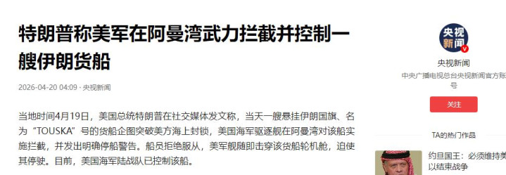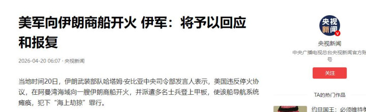 4月18日,伊朗伊斯兰创新卫队舟师文牍,由于好意思国违背息兵答应,未捣毁对伊朗口岸的海上闭塞,从本日傍晚起闭塞霍尔木兹海峡。