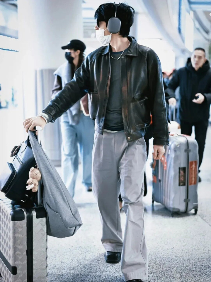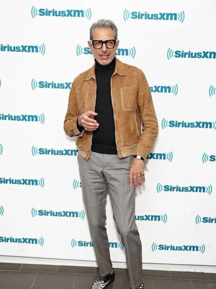 麂皮夹克 + 玄色高领衫 + 西装裤这种穿法走的是极简老钱风,全身神采限制在两个以内,附近皮革的当然后光进步整身造型的价位。