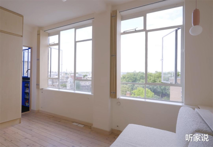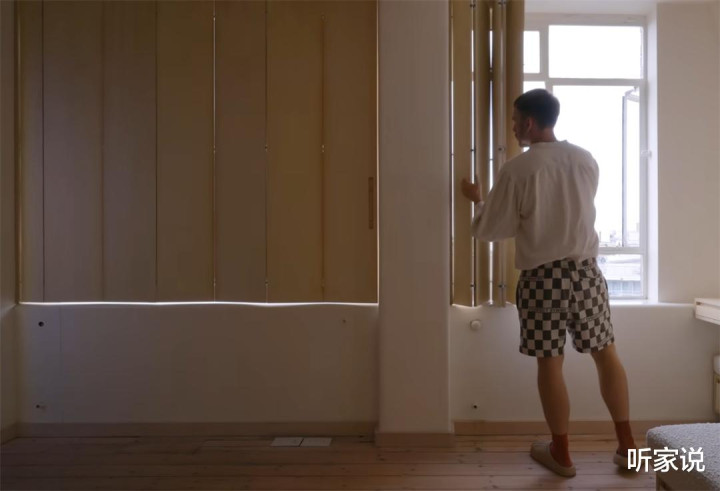 哦对了,为了不让正对着床的两扇大窗影响寝息,俩东说念主径直用折叠板代替窗帘,不仅遮光性能强,还能增多一定的隔音降噪能力,让这间盛开卧室秘密感更强一些。