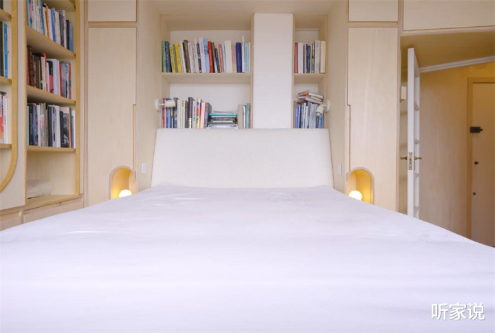 枕头和被褥都藏在了床头板的背面,且当床铺伸开后,围绕着床头的书架、收纳格、抽屉也都呈目前了目下,睡前唾手放个水杯手机之类的物品雷同便捷得很。