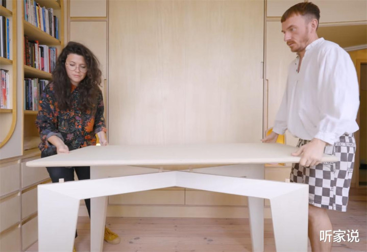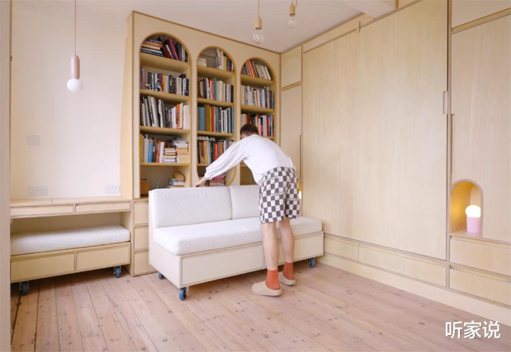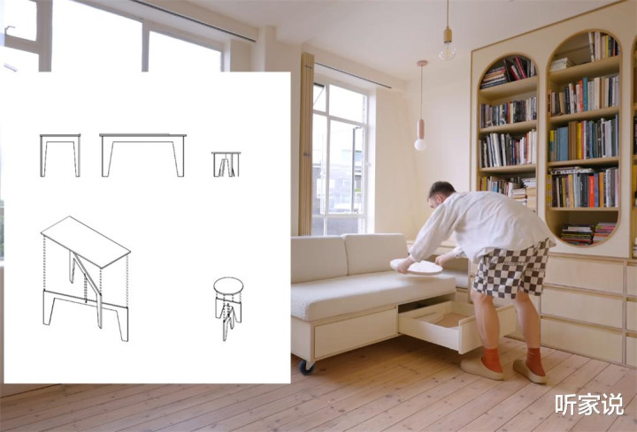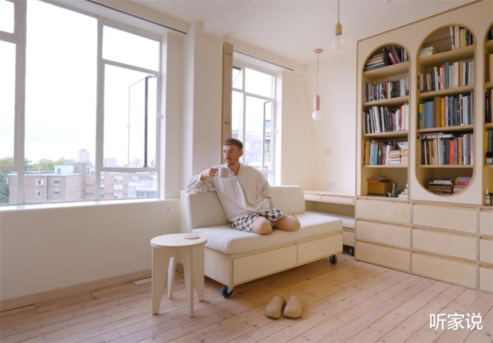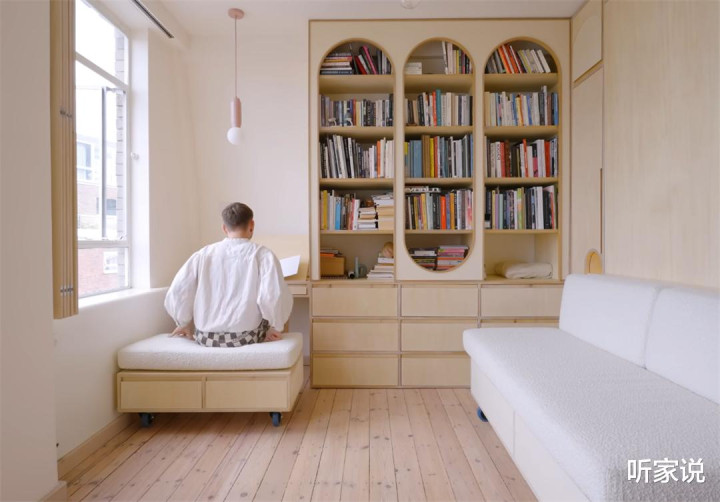 无意候,安娜和帕克会将沙披发在书厨旁,看书阅读;无意候,两东说念主又会把沙发推到窗户下方,吹吹风、晒晒太阳;而从沙发底部抽内拿出小凳子组装上,就又变成了一张下昼茶的茶桌和边几。