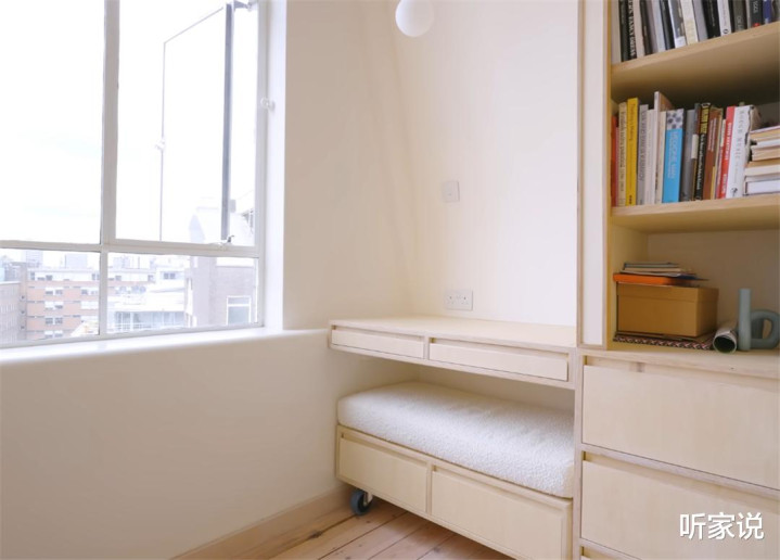 但两口子平常如故很少会用餐桌,大部分本领都是径直用足下的书桌和小餐椅代替桌子吃饭,省去了一展一收的艰苦,关于这24㎡的家来说,实质上大餐桌也等于个待客时的备用产品驱散。