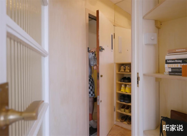 但此次改造后,愚弄门后空间作念出一组通顶式玄关柜,右侧大格放衣物和大件杂物,左侧分为险阻两格收纳鞋子,并在柜门上贴附镜子当穿衣镜,柜子虽小,坚抓少物状况后却也能保抓整洁。