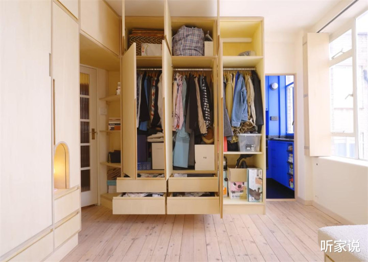参加厨房前,先说说这门边的大衣柜,它与床铺所在的柜子完全贯串,且作念成了通顶式想象,能将纵向空间充分愚弄起来,收纳各式各种的衣物和床品被褥,处置往常房间内收纳不及的问题。