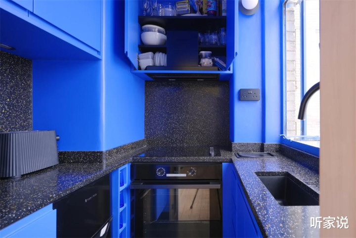 厨房里的装修,与家中其他空间造成了显然的反差——由白色+木色的浅暖色彩,变成了愈加冷冽的亮蓝色柜+玄色台面,既是为了营造视觉上的反差感,亦然思给蜗居增添些特质。