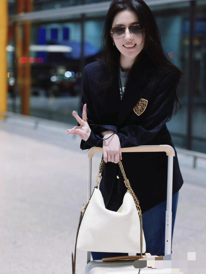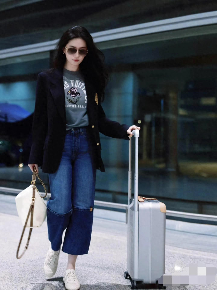 刘亦菲身穿一件藏蓝色的西装外衣,搭配灰色的短袖,下半身身穿九分牛仔裤,裤子如故拼接的,脚踩白色小白鞋。她一手拎着包包,一手拉着行李箱。